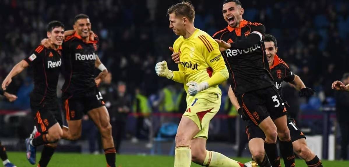 点球大战成为豪门崩塌的修罗场。前5轮双方交替命中,卢卡库第二个主罚,这位世界杯季军射手却将球踢偏,错失领先良机;科莫第四轮佩罗内点球被扑,那不勒斯本有望抓住机会,却在第8轮遭遇致命打击——中场核心洛博特卡的点球被科莫门将布特兹神勇扑出。随着肯普夫稳稳罚进,科莫以8-7锁定胜局,总比分8-7淘汰那不勒斯。8轮点球、2粒失点、1次绝杀,这场拉锯战中,年轻的科莫用极致的心理素质战胜了身价碾压的对手,布特兹最后一扑成为黑马封神的瞬间。